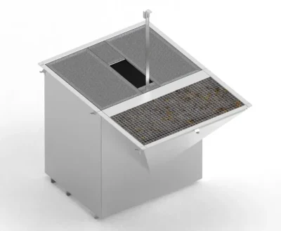 L’abrasif usagé est collecté dans une trémie située sous la zone de sablage. Ce système simple permet de centraliser facilement la récupération pour un transfert ultérieur.